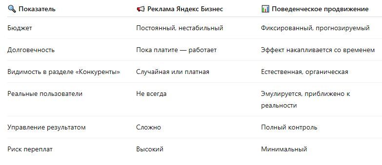 Вы продвигаетесь как бы "естественно" — в глазах системы. Яндекс видит рост интереса и считает вас приоритетным бизнесом в конкретной категории и локации.
